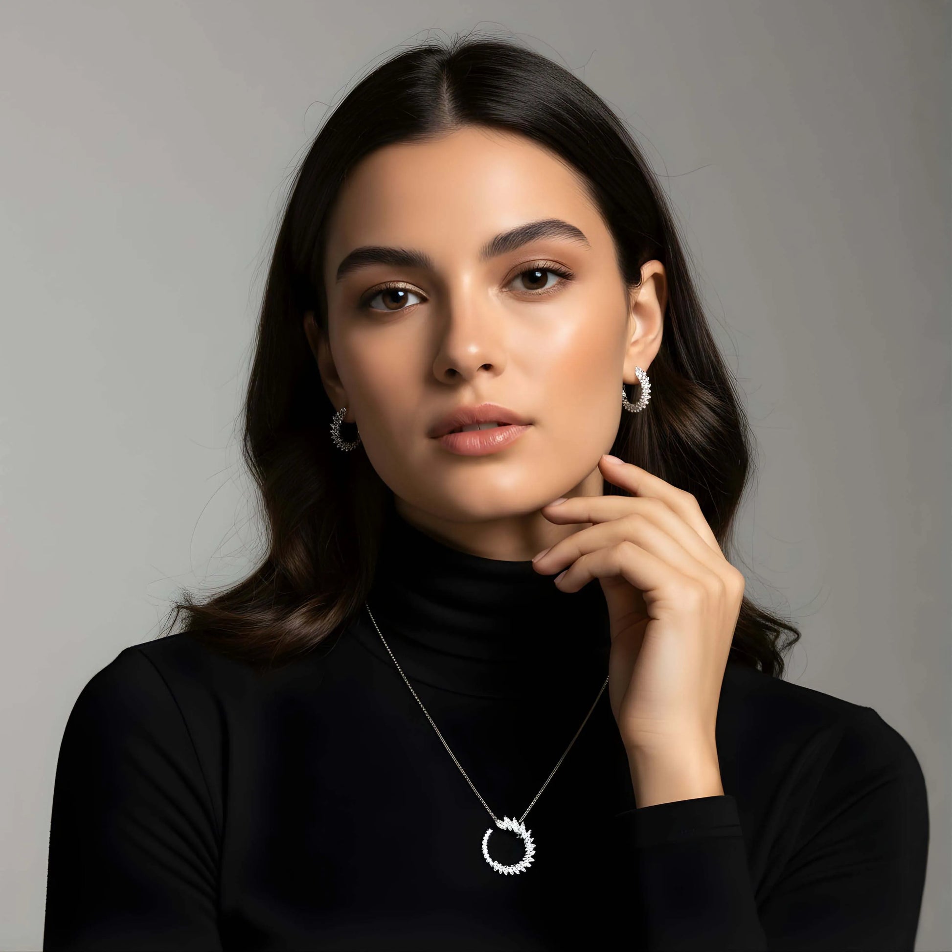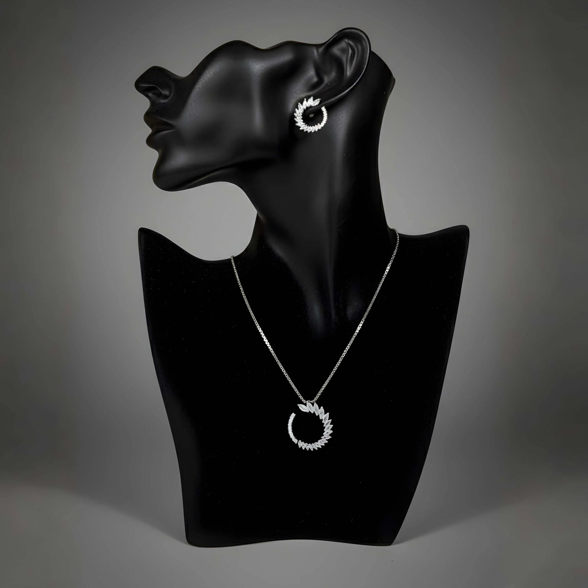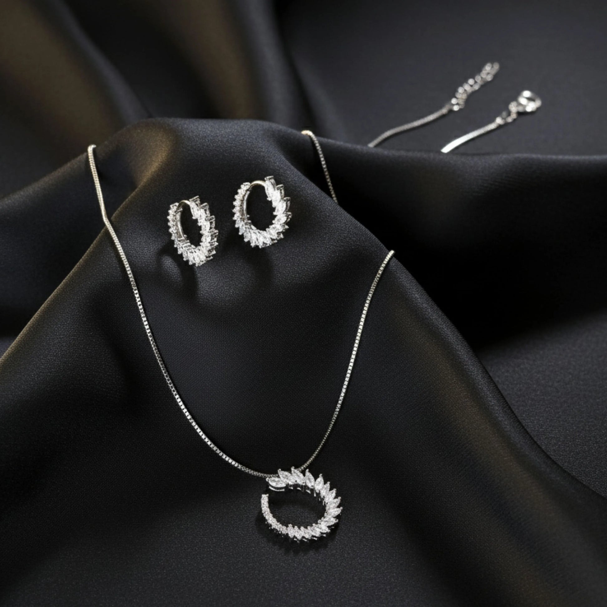 Shine with timeless elegance. The Crescent Charm Set features a dazzling crescent-shaped pendant paired with perfectly matching earrings, crafted with sparkling zircon stones on a sleek silver base. Inspired by the beauty of the moon, this set adds a touch of sophistication and charm to every outfit — whether it’s a special evening or a graceful everyday look.